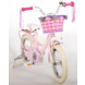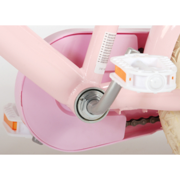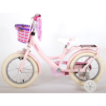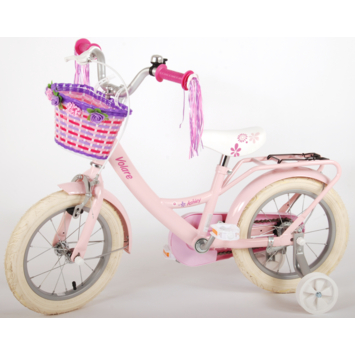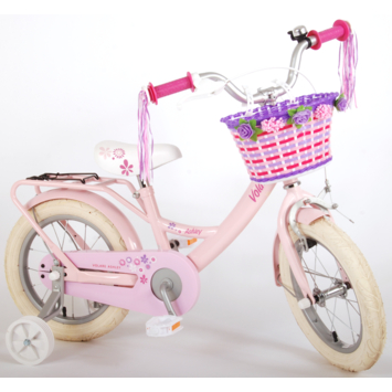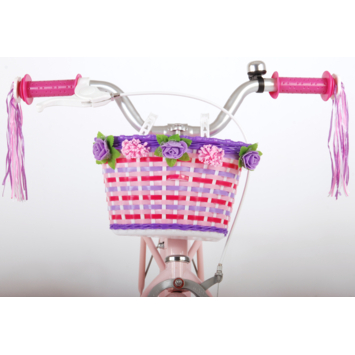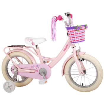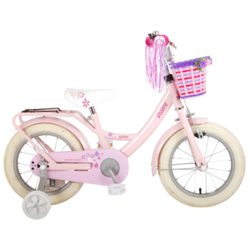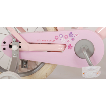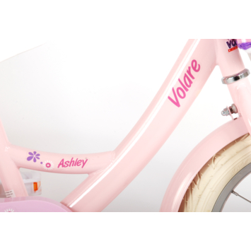 Volare Ashley 14 inch meisjesfiets. Deze beeldige Volare Ashley fiets is de fiets die ieder meisje wil hebben. De achterdrager is geintegreerd in het frame, waardoor de fiets een strak en modern uiterlijk heeft. Op deze achterdrager en in het fietsmandje kunnen alle belangrijke spulletjes mee worden genomen, waardoor uw kindje veilig de handjes aan het stuur kunnen houden. Met de handrem en terugtraprem kan de vaart worden verminderd. Het zachte zadel en de handvaten zorgen voor extra comfort en ter bescherming van de kleine vingertjes is de kettingkast gesloten. Met de fietsbel kun je iedereen laten weten dat je de hoek om komt. De afneembare zijwieltjes zorgen ervoor dat deze fiets een ideale fiets is om snel en goed te kunnen leren fietsen. De 14 inch luchtbanden van deze Volare Ashley fiets zorgen ervoor dat de fiets geschikt is voor meisjes tussen de 3.5 en 5 jaar oud met kledingmaat 98-110. Bovendien is de fiets voor 95% afgemonteerd, dus bijna fietsklaar. Wel zo gemakkelijk!