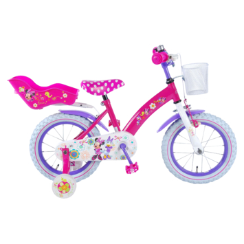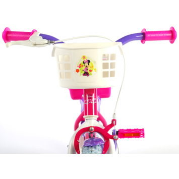 Disney Minnie Bow-Tique kinderfiets 12 inch. De Disney Minnie Mouse Bow-Tique meisjesfiets is onder alle meisjes uiterst gewild. Wij hebben een prachtige Minnie Bow-Tique fiets ontworpen in de prachtige kleurstelling roze. De fiets heeft een poppenzitje achter en een kunststof mandje voor, zodat ieder meisje haar spulletjes mee kan nemen maar haar handjes veilig aan het stuur kan houden. Verder heeft de fiets ter bescherming van de kleine vingertjes een gesloten kettingkast. Ook is de fiets voorzien van een handrem en een terugtraprem en frisse witte bandjes met metalen velgen. Om snel te kunnen leren fietsen heeft de fiets twee afneembare zijwielen. Welk meisje wil deze fiets nu niet? Official Licensed Disney Product.