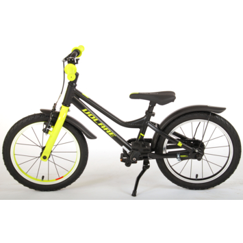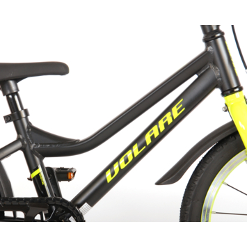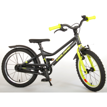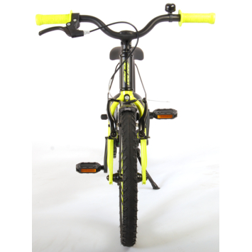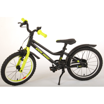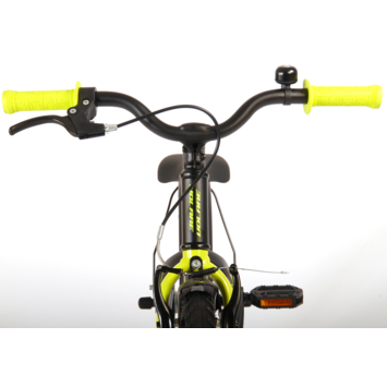 Volare Blaster 16 inch kinderfiets. De stoere Volare Blaster kinderfietsenreeks is van superieure kwaliteit. Het frame van deze fiets is gemaakt van ultra licht aluminium, slechts 5,9 kilo! Ook onderdelen zoals het stuur en het fietsstandaard zijn uit aluminium vervaardigd. Om vaart te kunnen minderen heeft de fiets een veilig Aluminium V-brake systeem met zowel een handrem als terugtraprem. De fiets heeft geen zijwielen, maar een praktisch en sterk aluminium standaard. De handvaten zijn van Kraton, een heerlijk zacht rubber, waardoor deze lekkerder in de hand liggen en extra comfort bieden. De zadelbuis is extra laag met een extra lange zadelpen, waardoor de fiets met uw kind mee kan groeien. De spatborden zijn mooi gevormd en iets langer dan normaal, waardoor zij al het opspattende vuil tijdens het crossen tegenhouden. Daarnaast heeft de fiets een aluminium smart control systeem, dat ervoor zorgt dat het stuur begrensd is (niet in hoogte verstelbaar). De stoere kettingkast is een grote toevoeging voor het krachtige en superstoere design van deze fiets met zijn strakke aluminium frame en groene details. De fiets is voor 85% afgemonteerd. De 16 inch luchtbanden maken dat deze fiets geschikt is voor jongens tussen de 4 en 6 jaar oud met kledingmaat 104-110. Deze Volare Blaster kinderfiets inspireert iedere jongen om zijn wereld te ontdekken!