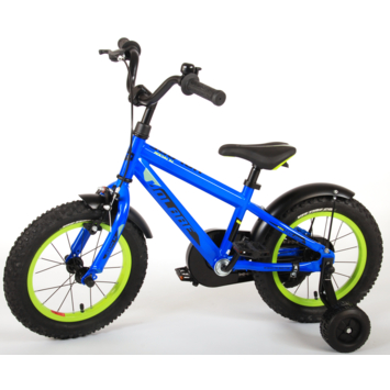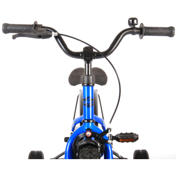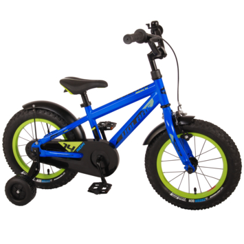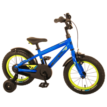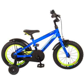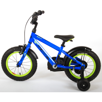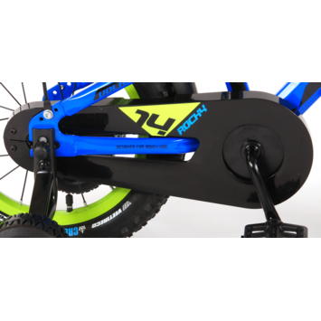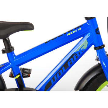 Volare Rocky 14 inch kinderfiets 95% afgemonteerd. De Volare Rocky kinderfietsrange is echt van superieure kwaliteit. De Rocky fiets heeft aluminium velgen, een aluminium stuurpen, betere kwaliteit trappers, zwarte spaken en een luxe super zacht zadel met greep voor ouders. De 14 inch Rocky is een stoere jongensfiets met extra brede banden, waar ieder kinderhart sneller van gaat kloppen. Ook de spatborden zijn extra groot en mooi gevormd waardoor zij al het opspattende vuil tegenhouden. Het stuur is in hoogte verstelbaar en de zadelbuis is extra laag met een extra lange zadelpen, waardoor de fiets met uw kindje mee kan groeien. De handvatten zijn gemaakt van Kraton, een zacht rubber, waardoor de handvatten heerlijk in de hand liggen. Het geometrische frame in de blauwe kleur met watertransfer stickers maakt van deze fiets een echte eyecatcher. De fiets heeft extra brede stoer uitziende zijwieltjes om snel te kunnen leren fietsen en een gesloten kettingkast om de kleine vingertjes te beschermen. Deze fiets is dé fiets om kinderen te inspireren om de wereld te gaan ontdekken. Bovendien is de fiets voor 95% afgemonteerd, dus bijna fietsklaar. Wel zo gemakkelijk!