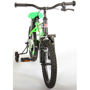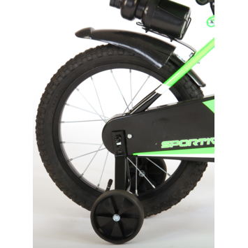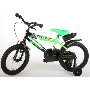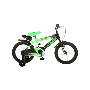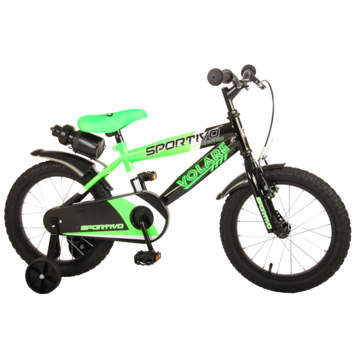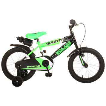 Volare Sportivo 16 inch kinderfiets. Het sterke stalen frame heeft met de stoere neon groen met zwarte kleurstelling een zeer sportieve uitstraling. Met de bidon in de praktische bidonhouder heeft uw kind altijd iets te drinken bij zich. De spatborden houden al het opspattend vuil tegen. Om vaart te minderen heeft de fiets zowel een hand- als terugtraprem. Ter bescherming van de kleine vingertjes is de kettingkast gesloten. Om snel te kunnen leren fietsen heeft de fiets afneembare zijwielen. De 16 inch luchtbanden maken de fiets geschikt voor stoere knullen tussen 4 en 6 jaar oud met kledingmaat 104-110. Bovendien is de fiets voor 95% afgemonteerd, dus bijna fietsklaar. Wel zo gemakkelijk!