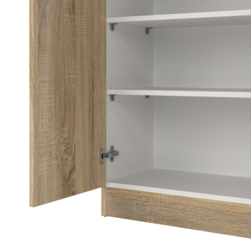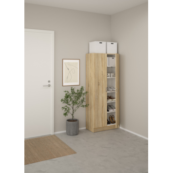 De Fabian kast is vervaardigd uit spaanplaat en afgewerkt met een eiken look. De gelakte afwerking geeft de kast een nette en tijdloze uitstraling. Dankzij het strakke design combineer je deze kast eenvoudig met andere meubels in huis.