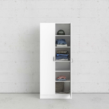 Achter de twee deuren bevinden zich vijf legplanken. Deze indeling maakt de kast geschikt voor het opbergen van diverse items zoals kleding, linnengoed of schoenen. Dankzij de hoogte van 170 cm en de breedte van 70 cm biedt de kast voldoende bergruimte zonder veel vloeroppervlak in te nemen.
