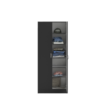 De kledingkast 2-deurs Fabian zwart hout 170 x 70 x 35 cm combineert een compacte afmeting met verrassend veel bergruimte. Door de zwarte kleur en het strakke ontwerp past deze kast moeiteloos in uiteenlopende interieurs. Ideaal voor gebruik in slaapkamer, logeerkamer of hal.