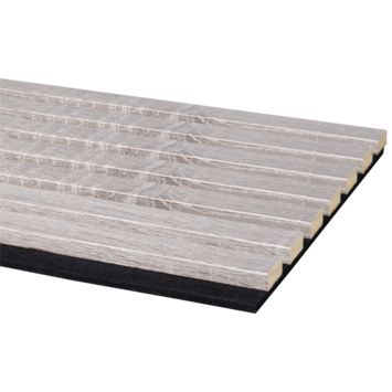 Met het kleurstaal van de lattenwand Decowall Acoustic grijs eiken kan je thuis beoordelen of het wandpaneel past bij jouw huis en inrichting. Het kleurstaal hoort bij het paneel lattenwand 260x30cm (artikel 263619)