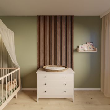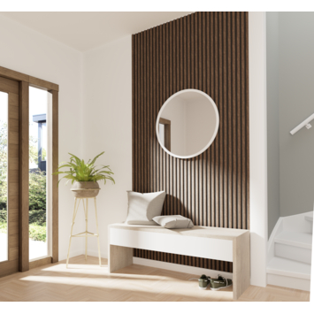 Met het kleurstaal van de lattenwand Decowall Acoustic walnoot kan je thuis beoordelen of het wandpaneel past bij jouw huis en inrichting. Het kleurstaal hoort bij het paneel lattenwand 260x30cm (artikel 263623)
