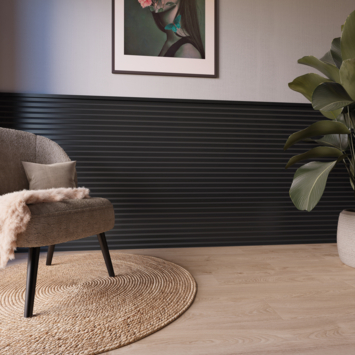 Met het kleurstaal van de lattenwand Decowall Acoustic zwart kan je thuis beoordelen of het wandpaneel past bij jouw huis en inrichting. Het kleurstaal hoort bij het paneel lattenwand 260x30cm (artikel 263625)