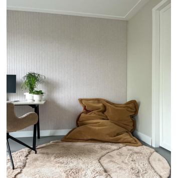 Mooie rustige tint, goed te snijden materiaal en met een goede akoestische werking. Wij hebben de platen met de vlakke kant naar boven toegepast, omdat we dat rustiger vonden bij wat we al in huis hebben. We hebben alle 8 de panelen met dotjes van 1 tube kit vastgezet op de wand. Het materiaal is namelijk heel licht. Druk het wel goed aan.