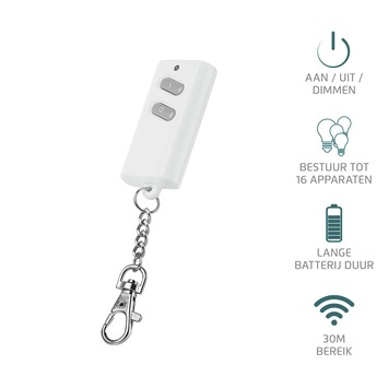 De sleutelhangerafstandsbediening kun je ook combineren met één of meerdere KlikAanKlikUit-ontvangers, zoals schakelaars, dimmers, rolluiken, zonwering en draadloze deurbellen. Naast aan- of uitschakelen, kun je met de sleutelhangerafstandsbediening ook je dimbare lampen dimmen. De afstandsbediening heeft een bereik tot 30 meter. Dit bereik gaat zelfs door muren heen.