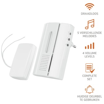 Je stopt de gong, ofwel de ontvanger, in het gewenste stopcontact en plakt de draadloze drukknop op de gewenste positie. Kies een volume en melodie. Nu kun je de draadloze deurbel (ontvanger) in een ander stopcontact plaatsen. Hij zal nog steeds reageren op de drukknop. Handig op plaatsen waar veel geluid is door bijvoorbeeld muziek of de wasmachine.