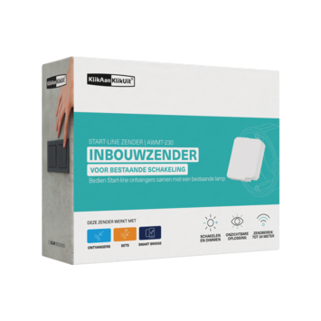 Wanneer je met de wandschakelaar de lamp aanzet, stuurt de inbouwzender een aan-signaal naar één of meerdere KlikAanKlikUit-ontvangers. Zo kunt je bijvoorbeeld tegelijkertijd 2 schemerlampen draadloos inschakelen. Wanneer je met de wandschakelaar de aangesloten verlichting uitschakelt, stuurt de inbouwzender een uit-signaal naar de Klik Aan Klik Uit-ontvanger(s). De AWMT-230 inbouwschakelaar is geschikt voor verlichting met een maximaal wattage van 230watt. Deze inbouw zender is alleen te gebruiken met een standaard wandschakelaar en is niet te gebruiken met een pulsschakelaar, hotelschakeling of wanddimmer.