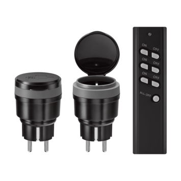 De set bestaat uit twee stopcontactschakelaars en een afstandsbediening.