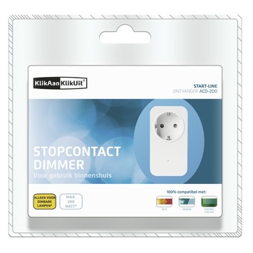De Klik Aan Klik Uit ACD-200 stekkerdoos met dimmer is geschikt voor het dimmen van dimbare led-verlichting en dimbare spaarlampen (van 3 tot 24watt) en alle overige dimbare verlichting (van 20 tot 200watt). De ontvanger is compact en past in vrijwel elk interieur. Deze Klik Aan Klik Uit stekkerdoos kun je natuurlijk combineren met andere KlikAanKlikUit-producten die je bij GAMMA kunt kopen.