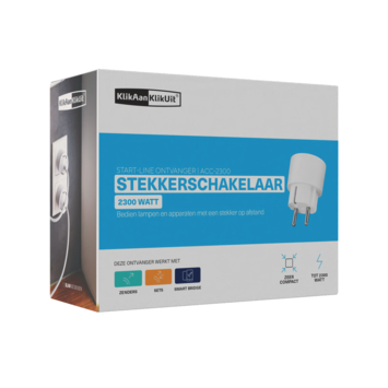 De Klik Aan Klik Uit stekkerdoos schakelaar ACC-2300 met randaarde kun je in een stopcontact steken om een lamp of apparaat aan te sluiten die je dan draadloos kunt in- en uitschakelen met 1 tot maximaal 6 KlikAanKlikUit zenders, zoals een afstandsbediening en draadloze wandschakelaar. Deze witte stekkerdoos schakelaar heeft een maximum belastbaar vermogen van 2300 watt. De schakelaar is door zijn kinderbeveiliging ook veilig. Daarnaast heeft hij een draadloos bereik op de zender van 30 meter. Hierdoor kan jij bijvoorbeeld vanaf de bank je verlichting bedienen met je afstandsbediening (niet meegeleverd).