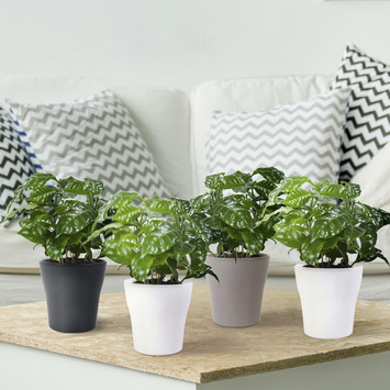 Deze Coffea Arabia is een enorme laatbloeier. De plant staat namelijk 1 keer per 4 jaar in bloei. De Koffieplant krijgt dan prachtig witte bloemen. De glimmende bladeren kun je gelukkig altijd bewonderen. In Nederland is deze plant nog niet echt bekend. Hij komt dan ook oorsponkelijk helemaal vanuit Ethopië, maar dankzij GAMMA haal je hem eenvoudig je woonkamer in. Is 1 plant niet voldoende? Dat komt goed uit, want de Koffieplant wordt per 4 stuks aangeboden.