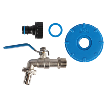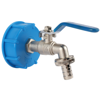 De adapter is voorzien van een tap met een 1/2" buitendraad-inlaat, waarmee je eenvoudig vloeistoffen uit de tank kunt aftappen. Deze tap is gemonteerd op een 3/4" schroefdraad met een 12,5 mm slangtule, zodat je er direct een 12,5 mm slang op kunt aansluiten om vloeistof uit de IBC-tank te laten stromen.