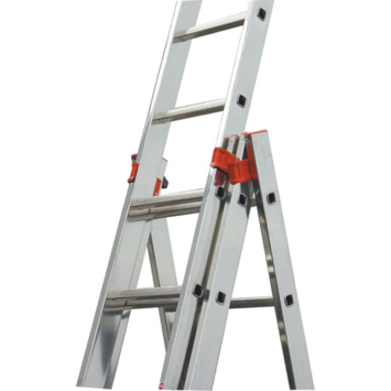 De Krause Tribilo Schuifladder is een multifunctionele, driedelige aluminium ladder die kan worden gebruikt als schuine, uitschuifbare en vrijstaande ladder met een uitschuifbaar ladderdeel. Deze schuifladder is voorzien van gepoedercoate stalen geleideprofielen voor meer gebruiksgemak, van zelfvergrendelende hendels (AutoSnap-systeem) voor veilig transport en van weerbestendige en scheurvaste spanbanden. Daarnaast beschikt deze schuifladder over een brede stabilisator voor nog meer stabiliteit en over antislip voetkappen en pluggen (SafetyCap).