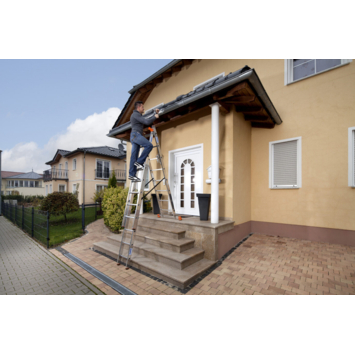 De Krause Tribilo Schuifladder is een multifunctionele, driedelige aluminium ladder die kan worden gebruikt als schuine, uitschuifbare en vrijstaande ladder met een uitschuifbaar ladderdeel. Deze schuifladder is voorzien van gepoedercoate stalen geleideprofielen voor meer gebruiksgemak, van zelfvergrendelende hendels (AutoSnap-systeem) voor veilig transport en van weerbestendige en scheurvaste spanbanden. Daarnaast beschikt deze schuifladder over een brede stabilisator voor nog meer stabiliteit en over antislip voetkappen en pluggen (SafetyCap).