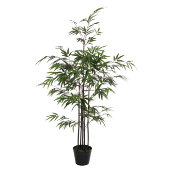 Klaar om zorgeloos te genieten? De kunstplanten voor binnen zijn niet van echt te onderscheiden, maar hebben geen enkel onderhoud nodig. Kenmerkend aan deze Bamboe zijn de langwerpige, tot in detail nagemaakte, groene blaadjes die gelijk voor een botanische sfeer in huis zorgen. Zeker in combinatie met de natuurlijke, donkerbruine stammen van echt hout! Zo is hij net echt. De kunstplant is stevig verankerd in een zwarte kunststof pot, maar moet voor gebruik wel nog in model worden gebracht. De vuistregel hierbij is: het blad moet je aankijken. Zet hem na het uitvouwen zo neer, of gebruik de kunststof pot als stevige basis voor een sierlijke overpot. Combineer hem met andere kunstplanten en -bloemen uit de collectie en breng meer groen in huis. Na het uitvouwen is de Bamboe 120 cm hoog met een diameter van 65 cm.