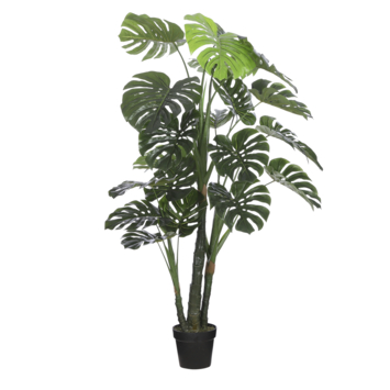 Klaar om zorgeloos te genieten? De kunstplanten zijn niet van echt te onderscheiden, maar hebben geen enkel onderhoud nodig. De Monstera wordt ook wel gatenplant genoemd staat bekend om de grote bladeren met gaten. De bladeren zijn uitgevoerd in verschillende maten en groentinten voor een natuurlijk effect. De plant is stevig verankerd in een zwarte kunststof pot, maar moet voor gebruik wel nog in model worden gebracht. De vuistregel hierbij is: het blad moet je aankijken. Zet hem na het uitvouwen zo neer, of gebruik de kunststof pot als stevige basis voor een sierlijke overpot. De Monstera is ca. 150 cm hoog en heeft een diameter van 80 cm.