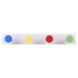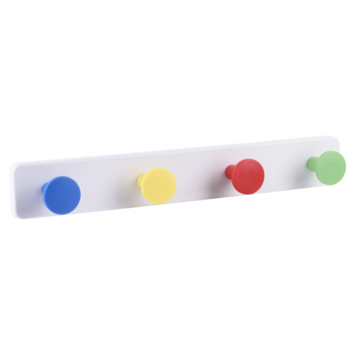 Deze vrolijke kunststof kapstok fleurt elke ruimte op! De 40cm brede kapstok heeft 4 knoppen met een diameter van 4cm in de kleuren blauw, geel, rood en groen. Voldoende ruimte om je tas, jas en/of accessoires aan op te hangen. Geef iedere ruimte een speelse look met deze praktische en kleurrijke kapstok.
