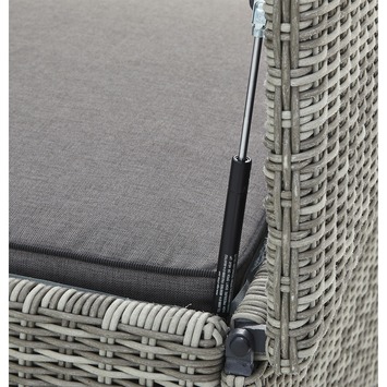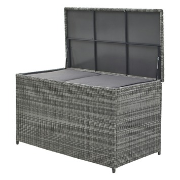Deze stevige, luxe kussenbox van grijs wicker heeft een moderne en natuurlijke uitstraling. Hij past perfect bij de loungeset Trentino, maar is ook uitermate geschikt om met andere meubelen te combineren. De kussenbox is 22x85x153 cm en geschikt voor het opbergen van de 6 zitkussens.