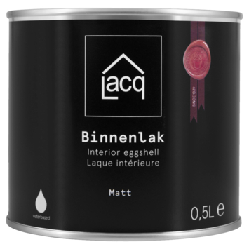 Lacq binnenlak mat is een zeer dekkende watergedragen lak voor binnen in matte afwerking. De lak is makkelijk in gebruik, reukarm en sneldrogend. Goed reinigbaar, slijt- en krasvast, resistent tegen handvetten en zwakke chemicaliën. Lacq binnenlak is verkrijgbaar in bijna elke gewenste kleur.