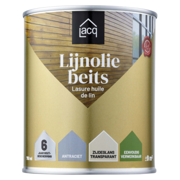 Lacq zuivere Lijnolie beits transparant antraciet 750 ml is een authentiek lijnolie beschermingsmiddel voor alle houten ondergronden met een zijdeglans afwerking. Op ambachtelijke wijze bereid. De combinatie van houtolie en lijnolie zorgt voor een optimaal resultaat. Door deze unieke samenstelling van grondstoffen blijft het de beitslaag lang flexibel zodat deze niet scheurt op hout. Het voedt het hout van binnen uit en biedt langdurige bescherming tot wel 6 jaar!