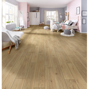 Creëer een sfeervolle uitstraling met de laminaat vloer in blond eiken. De vloer wordt gekenmerkt door zijn mooie, stevige uitstraling en gebruiksvriendelijkheid. Een echte houtstructuur De laminaatplank met een voelbare houtstructuur heeft een V-groef aan de lange zijde, waardoor het oogt als een authentieke plankenvloer.