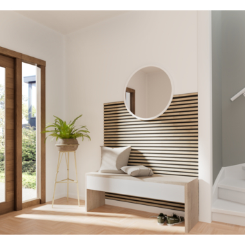 Met de CanDo green Decowall Acoustic geef je eenvoudig een warme en stijlvolle uitstraling aan je interieur. Deze kamerhoge lattenwand van 260 cm heeft een viltlaag aan de achterkant, wat zorgt voor geluidsabsorptie en een betere akoestiek in de ruimte. De wand is gemaakt van vilt van gerecyclede PET-flessen en PEFC-gecertificeerd hout uit verantwoord beheerde bossen. Dankzij het lichte gewicht is de wand eenvoudig te vervoeren en te monteren, waarbij je kunt kiezen voor lijmen of schroeven. Eén paneel bedekt 30 cm muur en de verpakking bevat twee panelen. De MDF-ommantelde latten zijn beschikbaar in verschillende decoren en kunnen netjes worden afgewerkt met eindprofielen, die zowel horizontaal als verticaal te gebruiken zijn.