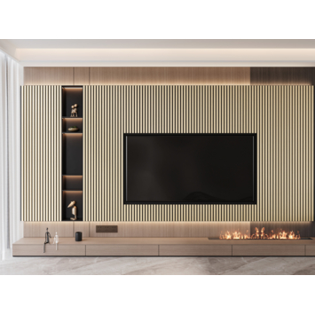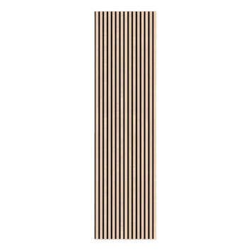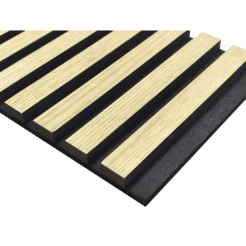 Het paneel is 260 bij 52,6 cm. De houten latten zijn 2,5 cm breed en de ruimte tussen de latten is 1,4 cm. Het vilt is van materiaal zoals gerecyclede PET flessen gemaakt. Op het vilt zitten zwarte MDF latten die zijn voorzien van echt hout fineer. Let op! Hout kan verkleuren in de zon, zorg ervoor dat de panelen beschermd worden tegen overmatig zonlicht. Omdat hout een natuurproduct is, kan het in het begin een geur afgeven. Ventileer uw ruimte en dan zal de geur naar verloop van tijd wegtrekken.