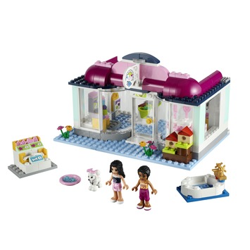 Lego Friends dierensalon (41007). Was en trim de honden op de draaibare tafel. In het winkelgedeelte van de Lego Friends dierensalon kan de baas op zoek gaan naar hondenvoer en allerlei accessoires. De Lego dierensalon is geschikt voor kinderen van 6 tot 12 jaar.