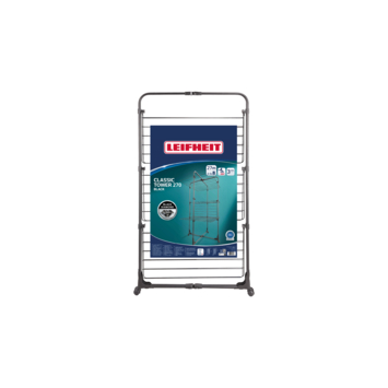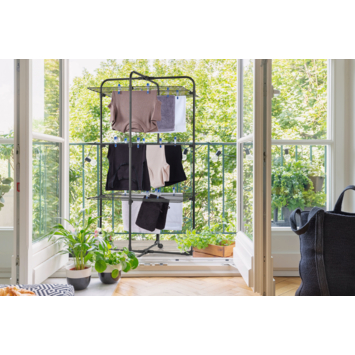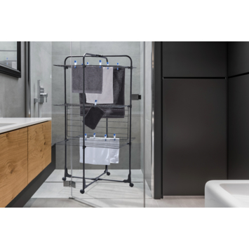 Met een footprint van slechts 68 x 68 cm past deze zwarte droogtoren zelfs in een douchecabine of smalle gang. Toch biedt hij maar liefst 27 meter drooglengte, verdeeld over drie niveaus – genoeg voor 3 volle wasmachineladingen.