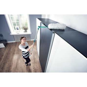 ik ben niet zo groot maar met deze duster kan ik overal bij. Hij maakt makkelijk en zeer goed schoon.