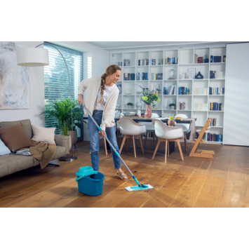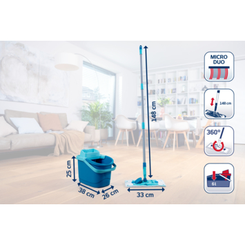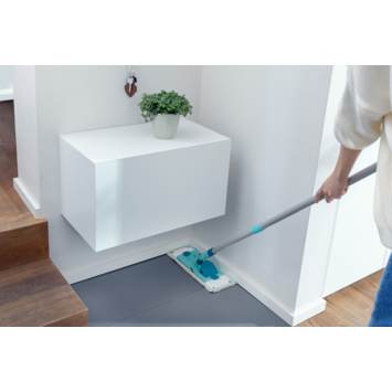 Maak kennis met de Leifheit Power Clean Micro Duo dweil, jouw nieuwe partner in vloerreiniging. Deze vloerwisser biedt een grondige en hygiënische reiniging van harde vloeren. Dankzij de innovatieve cleanblades en het speciale Micro Duo vloerdoek verwijder je eenvoudig vuil en zelfs 99% van virussen en bacteriën. Geen geknoei meer: met de telescopische steel en de 360° draaibare kop kan je moeiteloos alle hoeken bereiken. En het beste? Je kunt hem zonder bukken uitwringen, wat het schoonmaken een stuk eenvoudiger maakt. De lange levensduur van deze vloerwisser garandeert dat je er lang plezier van hebt. Maak van jouw vloer een stralend schoon oppervlak met de Leifheit Power Clean vloerwisser M.