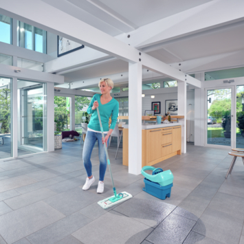 De Leifheit Profi XL vloerwisserset met wieltjes maakt schoonmaken hygiënisch en comfortabel: geen natte handen en niet meer bukken. De set bevat een emmer met persopzet op wieltjes en de Profi micro duo vloerwisser. Met één voetklik wring je de mop moeiteloos uit, net zo droog als met de hand. De 2-vezel-mopdoek reinigt grondig tot in voegen en hardnekkig vuil, is wasbaar tot 400 keer op 60°C en heeft een wisbreedte van 42 cm. Het 360°-scharnier maakt zigzag reinigen en schoonmaken onder en rondom meubels eenvoudig. Praktisch, duurzaam en mobiel schoonmaaksysteem voor alle vloeren