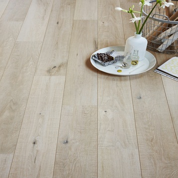Dit kliklaminaat geeft een mooie frisse uitstraling. De kleur geeft ruimte aan het interieur. Door de fijne zaagsnede en lage repetitie van planken benadert deze vloer een echte houten vloer.