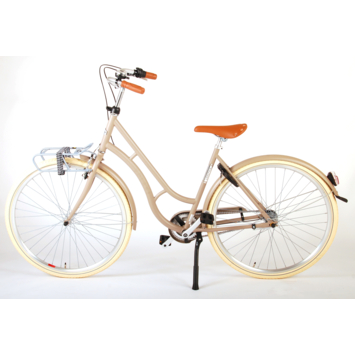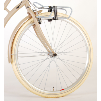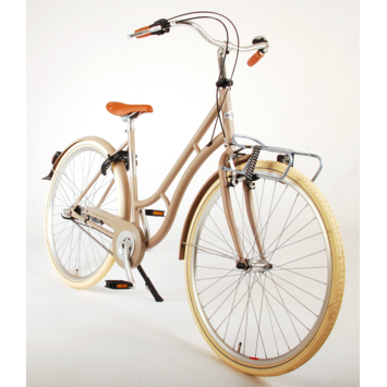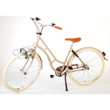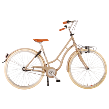 Volare Lifestyle tienerfiets 43 centimeter. Deze fiets, onderdeel van de prachtige Volare Lifestyle range, past perfect in de lifestyle van de hedendaagse tiener. Het moderne stalen frame van deze fiets heeft een toffe zandkleur en op de voorbagagedrager kunnen alle spullen worden meegenomen. De handvaten zijn voor extra comfort gemaakt van Kraton, een heerlijk zacht rubber. Om vaart te maken heeft de fiets Shimano Nexus 3 versnellingen en om vaart te minderen beschikt de fiets over een handrem en een terugtraprem. Verder beschikt de fiets over een fietsbel en een fietsslot. De mooi gevormde spatborden houden al het opspattende vuil en vocht tegen. Om de fiets te parkeren heeft hij een fietsstandaard. Voor de veiligheid heeft de fiets verlichting aan de voorkant en aan de achterkant. De 28 inch banden en het frame van 43 centimeter hoog maken de fiets geschikt voor dames vanaf 12 jaar oud met een binnenbeenlengte tussen de 78 en 95 centimeter. De voordrager is afneembaar.