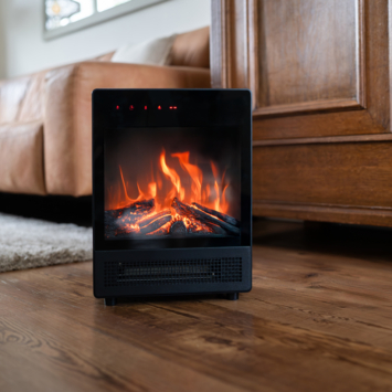 Dankzij de compacte afmetingen van 38,7 x 29,2 x 15,8 cm (hxbxd) past deze elektrische kachel vrijwel in iedere ruimte en verplaats je hem eenvoudig. De zwarte kunststof haard is voorzien van een traploos instelbare thermostaat en een handige timerfunctie. Met de timerfunctie stel je eenvoudig in na hoeveel uur de haard automatisch uitschakelt, handig voor extra veiligheid en energiebesparing. Bovendien beschikt de kachel over een omval- en oververhittingsbeveiliging. Zodra hij omvalt of te warm wordt, schakelt de haard direct uit. Onbezorgd genieten dus!