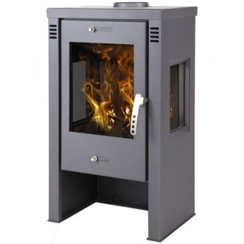 Stoere houtkachel waarbij de vlammen vanuit drie kanten te zien zijn. Maximale warmteopbrengst 10.5 kW en een verwarming capaciteit van 130 m3.