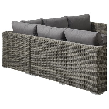 Het tuinmeubel is 66 centimeter hoog, 242 centimeter breed en 242 centimeter diep. De bijhorende hocker is 73 centimeter lang, 73 centimeter breed en 30 centimeter hoog.