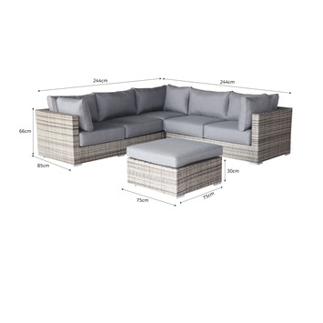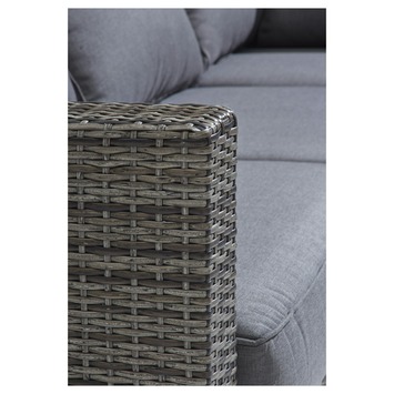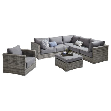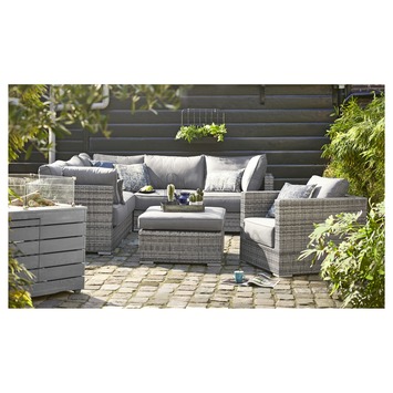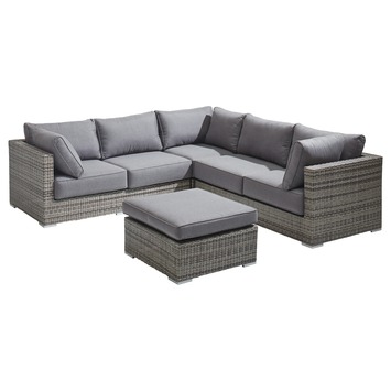 Loungehoekset Varese is een tuinset waarmee u een echte zithoek buiten creëert. De set bestaat uit een hoekbank en een tafel die gemaakt zijn van grijskleurig wicker. Dit kunststof materiaal is weerbestendig. Heel handig dus, u hoeft voor de bescherming van uw meubelen niet eens een hoes te gebruiken. De bijgeleverde naturel kussens kunt u beter wel bewaren in een kussenhoes of kussenbox. De meubelen zijn mooi afgewerkt en hebben aluminium poten. Bij deze Loungeset Varese is ook een bijpassende fauteuil Varese verkrijgbaar.