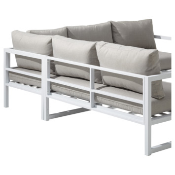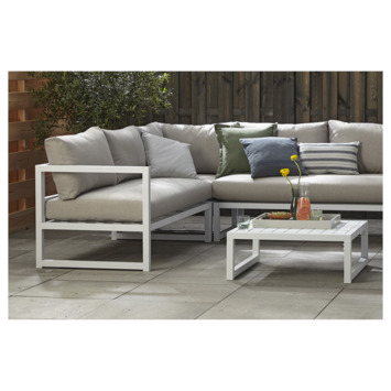 Om langer te kunnen genieten van de warme zomerdagen, is een loungeset ideaal. Je kunt deze in de tuin of op het balkon plaatsen. Loungeset Chelva van het merk Wakefield bestaat uit een bank, geschikt voor 5 personen, inclusief hocker. De tuinset heeft een witte kleur en is netjes voltooid met aluminium. De set bevat rug- en zitkussens waardoor je heerlijk lang kunt genieten. Deze kussens zijn wit gekleurd. Ook heeft de set arm- en rugleuningen. De hocker kun je gebruiken om servies op te plaatsen. De set wordt geleverd als bouwpakket. Het is verstandig om de kussens en banken op te slaan op een beschutte plek of af te dekken met een hoes, zodat je de set langer kunt gebruiken.