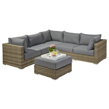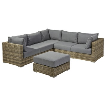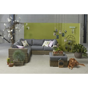 De loungehoekset Granada is gemaakt van bruin geschuurd wicker. Daardoor krijgt de set een natuurlijke en sfeervolle uitstraling. De set heeft een hoekopstelling en wordt geleverd inclusief hocker en kussens. De set is dus helemaal compleet.