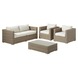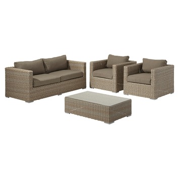 Loungeset Jakarta is een tuinset waarmee u een echte zithoek buiten creëert. De set bestaat uit een bank en twee losse fauteuils die gemaakt zijn van houtkleurig wicker. Dit kunststof materiaal is weerbestendig. Heel handig dus, u hoeft voor de bescherming van uw meubelen niet eens een hoes te gebruiken. De bijgeleverde naturel kussens kunt u beter wel bewaren in een kussenhoes of kussenbox. De loungeset wordt geleverd met een rechthoekige tafel voorzien van een glazen bovenplaat. Deze zorgt voor een glad, stabiel oppervlak en is handig schoon te maken. De meubelen zijn mooi afgewerkt en hebben aluminium poten.