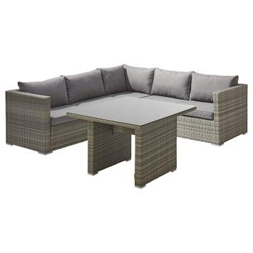 De elegante loungeset Lecce high dining is gemaakt van wicker. Wicker is een kunststof materiaal dat twee goede eigenschappen combineert. Het heeft de natuurlijke uitstraling van rotan, maar tegelijkertijd is het weerbestendig waardoor het mogelijk is de tuinmeubelen buiten te laten staan. De aluminium poten zorgen ervoor dat de bank niet slijt wanneer je de set verplaatst over het terras. Deze loungeset bestaat uit een hoekbank die geschikt is voor 5 personen en een bijpassende tafel. De tafel heeft een glad oppervlak waardoor hij makkelijk schoon te maken is en glazen stevig staan. De loungeset wordt geleverd inclusief bijpassende kussens. De stevige, dikke kussens zorgen voor een optimaal zitcomfort waardoor je niet snel op zal willen staan. Kortom, met deze loungeset van Wakefield kun je tot ver na zonsondergang blijven nagenieten van een heerlijke zomerdag.
