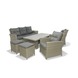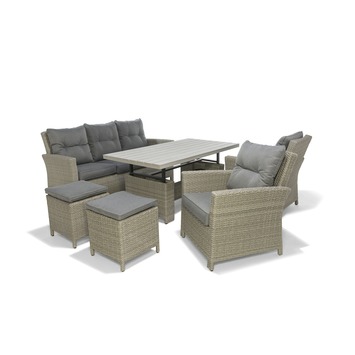 Een loungeset en een eetset in één? Kies voor deze loungeset Marbella! De set voor 6 à 7 personen bestaat uit 1 zitbank, 2 stoelen, 2 bijzetstoelen / poefs en 1 unieke rechthoekige tafel die je in de hoogte kan verstellen, zodat je 'm tegelijkertijd als lage loungetafel en hoge eettafel kan gebruiken. Knap, hé? Vinden wij ook! De set is gemaakt uit wicker in de kleur grijs. De comfortabele zitbank en stoelen beschikken over arm- en rugsteunen, evenals afneembare kussens in de kleur grijs voor extra comfort. Deze tuinmeubelset is ideaal voor wie graag familie en vrienden ontvangt om te aperitieven, te tafelen én lekker lang na te genieten. Goed om te weten: wicker is een weerbestendige gevlochten kunststof die tegen een stootje kan.