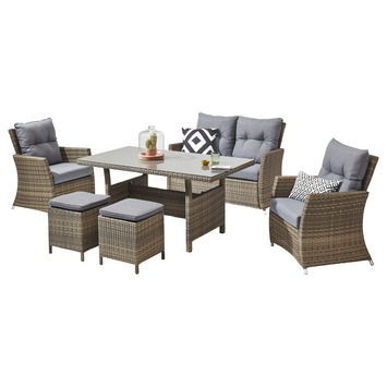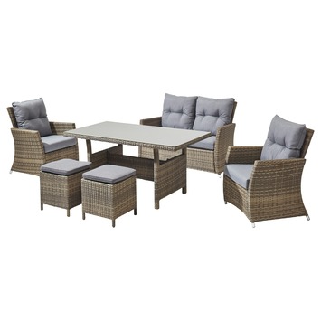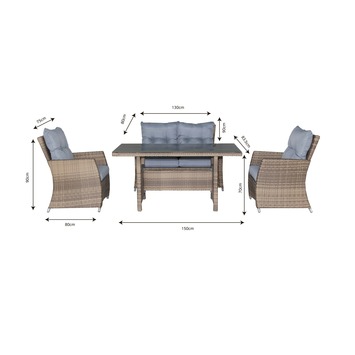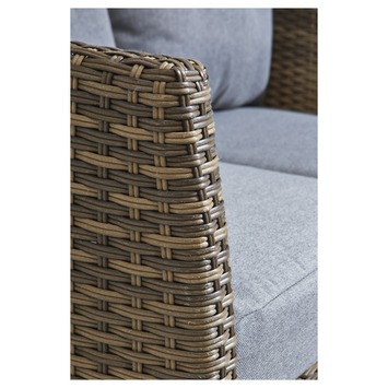 Op zoek naar een fijne loungeset waar je niet veel omkijken naar hebt? Ga dan voor loungeset Marseille high dining. Deze tuinset is gemaakt van bruin wicker. Wicker is een kunststof materiaal dat twee goede eigenschappen combineert. Het heeft de natuurlijke uitstraling van rotan, maar tegelijkertijd is het weerbestendig waardoor het mogelijk is de tuinmeubelen buiten te laten staan. De set bestaat uit een bank, 2 fauteuils, een tafel en kussens (exclusief de hockers) en biedt genoeg plek voor 4 personen. Deze loungeset combineert het functionele karakter van een eetset met het relaxende karakter van een loungeset. Dankzij het aluminium tafelblad is deze onderhoudsvriendelijk. Zoek je bijpassende artikelen? In de Marseille-serie zijn ook een loungestoel, balkonset, twee verschillende stoelen, dienblad en poef opgenomen. Kortom: met deze loungeset van Wakefield geniet je van iedere warme zomerdag.