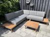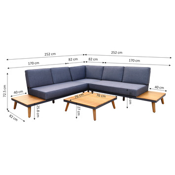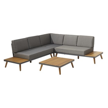 Je zit ruim en comfortabel met deze loungeset, bestaande uit een hoekcombinatie en een tafel. Dat is handig als je buiten wilt ontspannen met meerdere personen. De set combineert een houten frame met aluminium onderdelen. Daardoor is het geheel stevig en goed bestand tegen weersinvloeden. Door de combinatie van materialen vraagt de set weinig onderhoud. Je gebruikt deze set op een terras of veranda, bij voorkeur op een vlakke ondergrond. De tafel biedt genoeg ruimte voor hapjes of drinken. Door het robuuste ontwerp blijft de set stabiel staan, ook als je vaak opstaat of verplaatst. Het hardhout geeft de set een natuurlijke uitstraling, terwijl het aluminium zorgt voor een lichte constructie die je makkelijk verplaatst. Geschikt voor buitengebruik in elk seizoen.