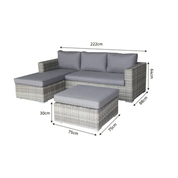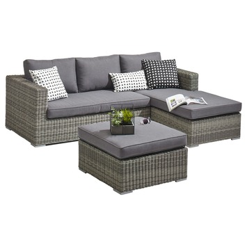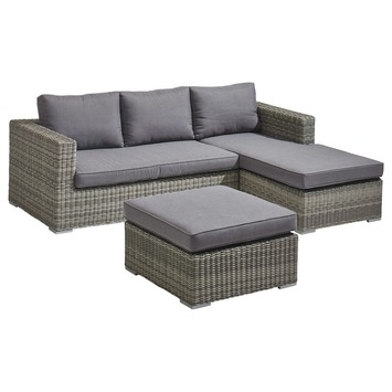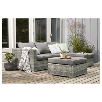 De loungeset Trentino Chaise Longue is gemaakt van grijs wicker. Dit geeft de tuinset een moderne en natuurlijke uitstraling. Het materiaal is ook weerbestendig, u kunt alles dus gewoon buiten laten staan. Loungeset Trentino bestaat uit een chaise longe, inclusief tafel en kussens. Dat betekent dat u in één keer een complete set koopt voor uw tuin. Mocht u de set toch willen uitbreiden, dan kunt u (in dezelfde serie) kiezen uit een loungehoekset, twee verschillende stoelen, een fauteuil of een loungestoel. Alles in één en dezelfde stijl. Het zitgedeelte bestaat uit twee banken en een hoekstuk. De bank is 2,22 meter lang zodat u er ook heerlijk languit op kunt liggen.